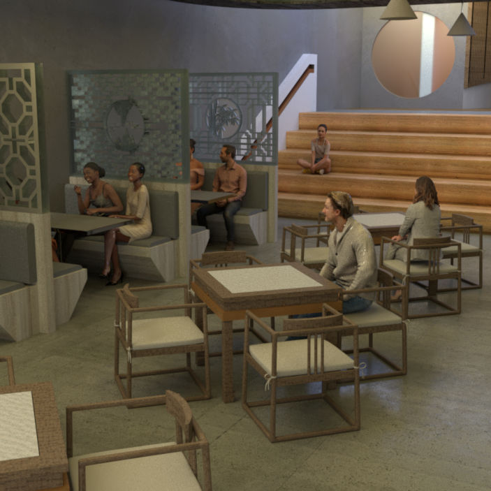 Structure: When I reach the site, its giant shopfront attracts me, and the glass facade gives customers a sense of transparency. The ground floor of the building is an opened space, which is very in line with my theme and is also an excellent carrier of both the exhibit and dining area; when it comes to the back of the ground floor, a mezzanine was set up, creating a private areas. The first floor is a broader space that gives the site a unique sense of opening and welcoming.